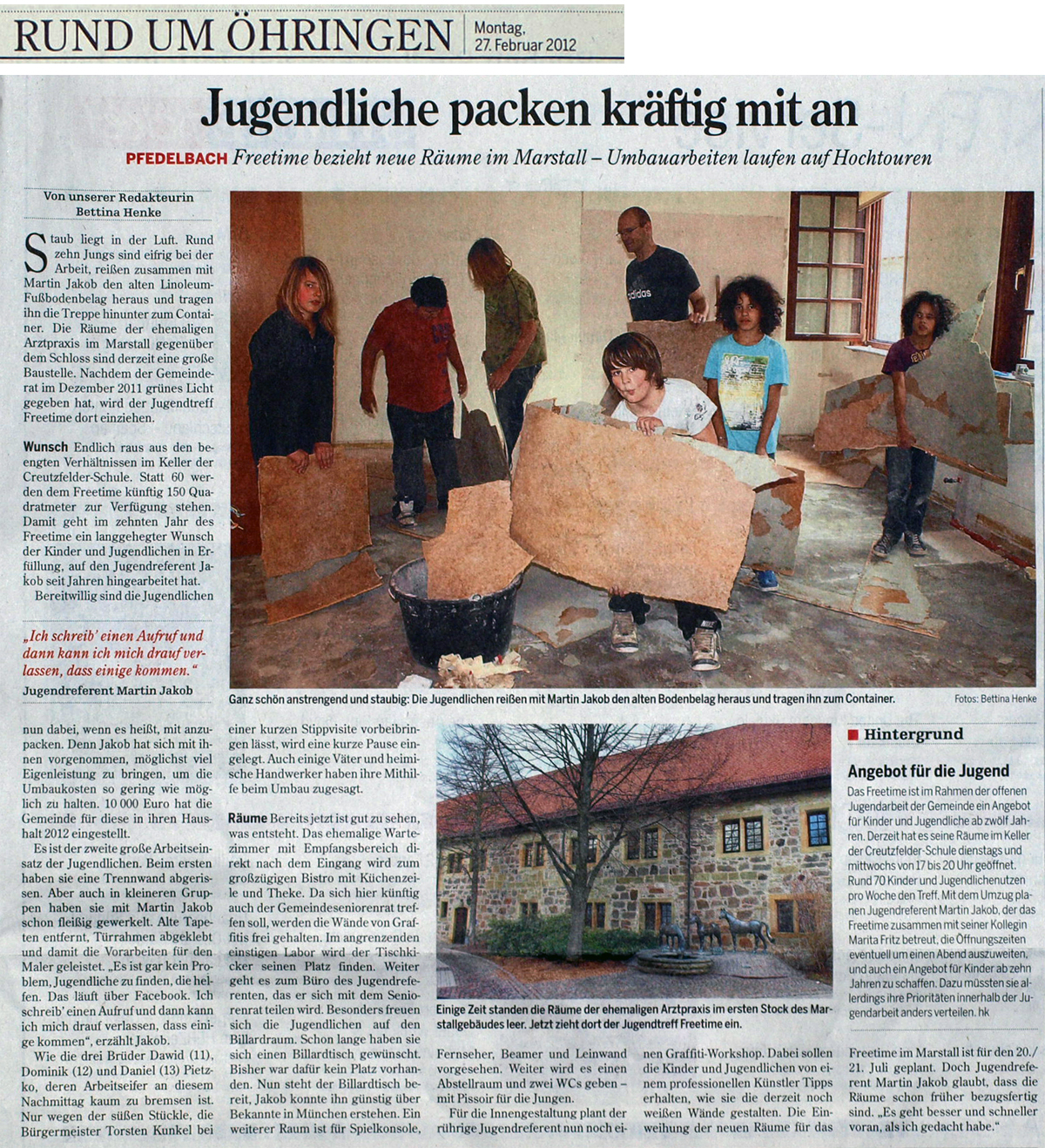 So langsam nimmt das neue Jugendhaus in Pfedelbach gestalt an. Seit 30. Januar 2012 laufen die Renovierungs- und Umbauarbeiten. Bis zur offiziellen Einweihung am 20./21. Juli 2012 soll aus der ehemaligen Arztpraxis im Marstallgebäude ein Jugendzetrum werden. Viele fleißige Helfer haben schon Hand angelegt, nicht nur die Jugendlichen selbst, die mit großem Eifer dabei sind. Auch Pfedelbacher Handwerker arbeiten zum Teil ehrenamtlich auf der Baustelle. Darüber bin ich sehr froh. Das spart nicht nur Geld, sondern zeigt auch, dass in Pfedelbach die Jugendarbeit im allgemeinen und die offene Jugendarbeit im besonderen einen hohen Stellenwert haben, für die man sich gerne engagiert.