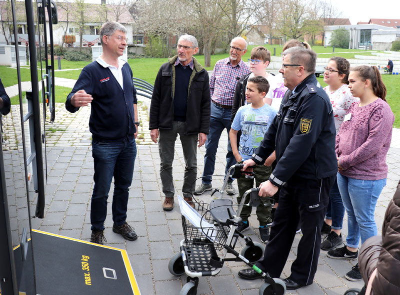 So geschehen am 10. April 2019 bei der Veranstaltung „Generation 60+ Mobil und sicher im Alter“ die in der Pfedelbacher Nobelgusch stattfand. Neben vielen Infoständen zum Thema Alter und Pflege gab es im Außenbereich der Nobelgusch einen Rollator-Parcours. Dieser wurde vom Polizeipräsidium Heilbronn aufgebaut und bot den anwesenden Senioren die Möglichkeit, den sicheren Umgang mit einem Rollator zu üben. Damit die älteren Menschen nicht alleine mit ihrem Rollator durch den Parcours laufen mussten, gab es „Wegbegleiter“. Dies waren Helfer der Gruppe „Senioren für Senioren Pfedelbach“ sowie fünf Jugendliche des Pfedelbacher Jugendzentrums Freetime in Begleitung von Jugendreferent Martin Jakob.