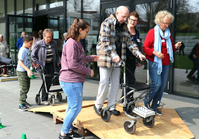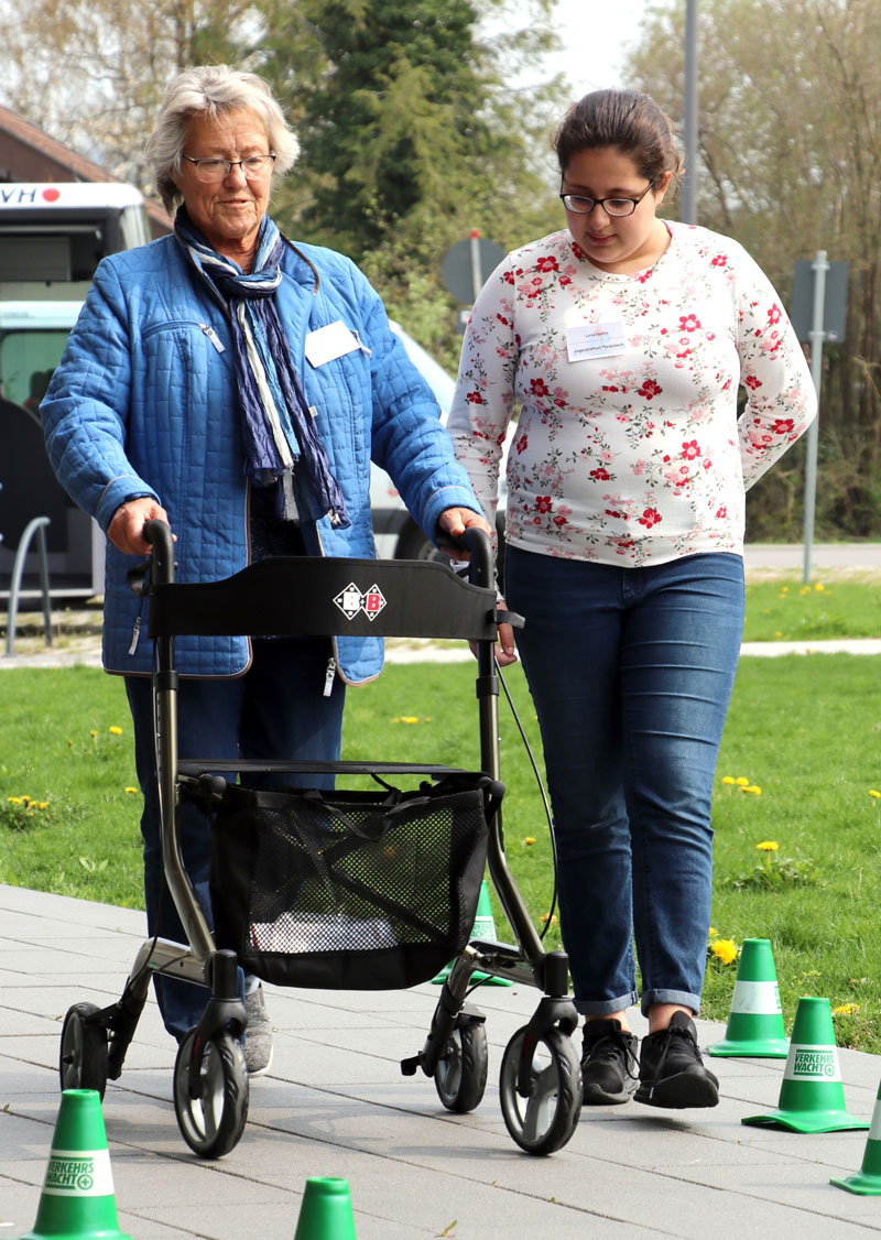 Noch vor Beginn der Veranstaltung bekamen alle „Wegbegleiter“ eine Einweisung von Herr Kempf von der Polizei. Anschließend durchliefen die Jugendlichen den Rollator-Parcours auch selbst einmal mit einem Rollator. Dies fiel ihnen verständlicherweise nicht sonderlich schwer, dennoch war es gut zu wissen wie sich das laufen mit einer solchen Gehhilfe anfühlt. Als der Rollator-Parcours dann für die Senioren geöffnet wurde, hatten die „Wegbegleiter“ alle Hände voll zu tun. Der Parcours fand großen Anklang bei den Besuchern und wurde rege genutzt. Immer in Begleitung eines Helfers vom Seniorenkreis oder einem der fünf Jugendlichen durchliefen die Senioren den Hindernisparcours. Nach zwei Stunden hatten alle Senioren ihren Rollatorführerschein erhalten und der Parcours wurde geschlossen.